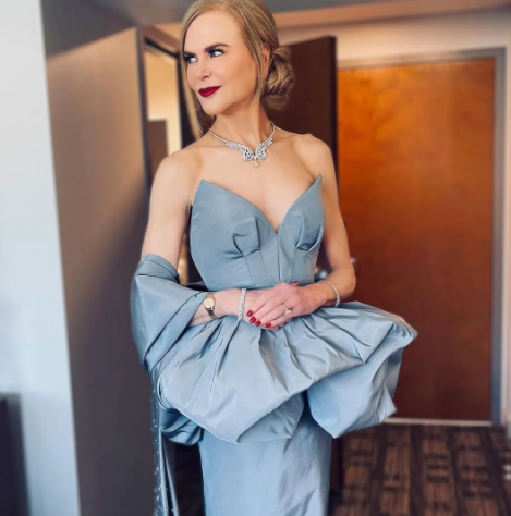 Nicole Kidman stunned in a gorgeous blue dress, complemented by an Omega Trésor, with an 18K Moonshine™ gold dial, presented on an 18K Moonshine™ gold mesh bracelet with a silk-like pattern and a special foldover clasp.
